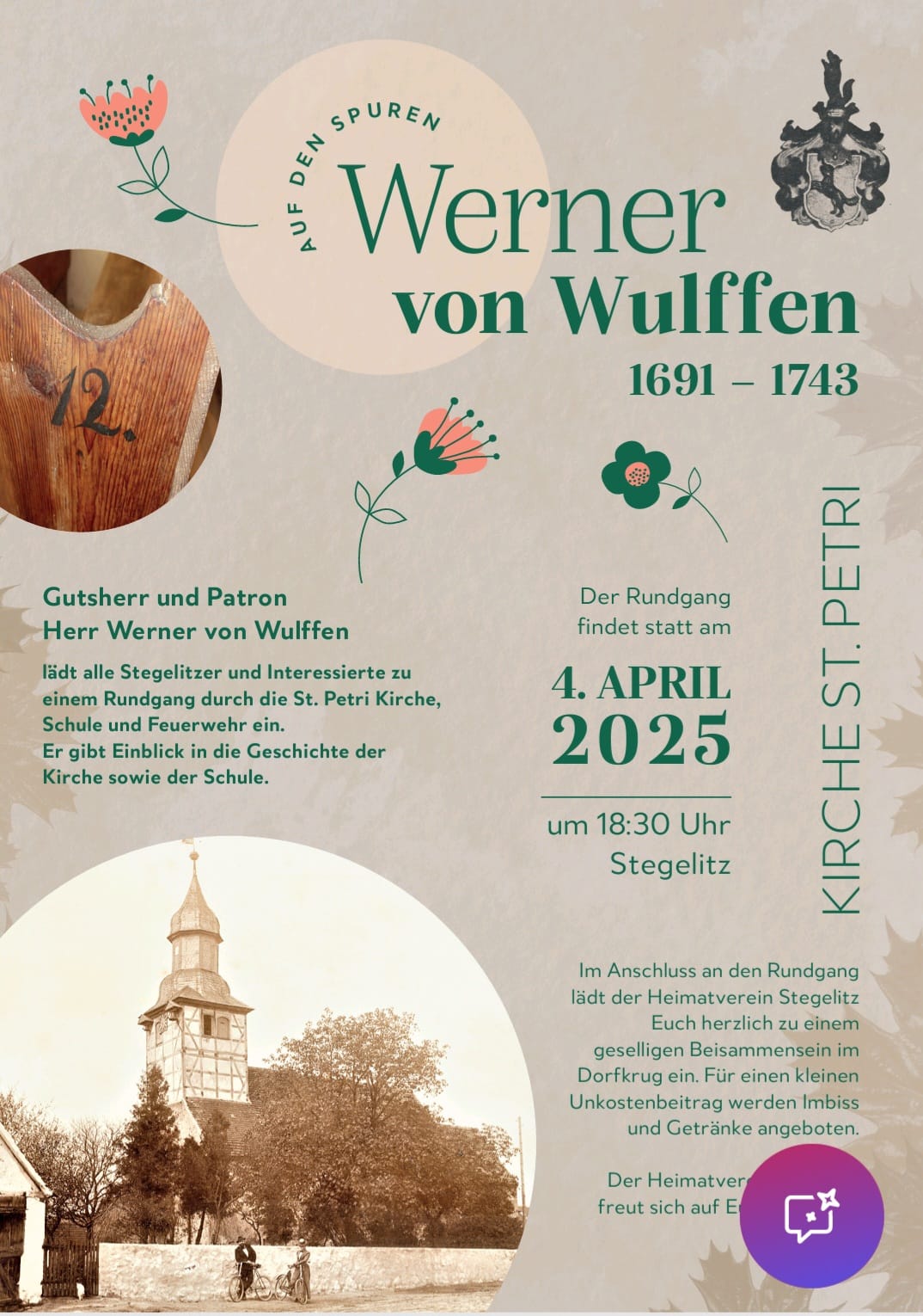 Gutsherr und Patron Herr Werner von Wulffen lädt alle Stegelitzer und Interessierte zu einem Rundgang durch die St. Petri Kirche, Schule und Feuerwehr ein.